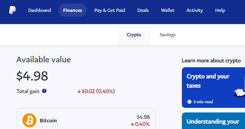 Open the crypto area in the app, or the Finances tab on your computer, and follow a few steps to instantly see your free $5 of free sats. For a bigger prize, buy your first crypto on PayPal through this link for $10 in BTC.