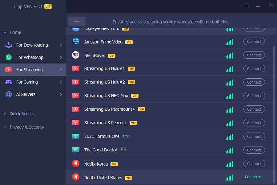 Home provides all the servers iTop VPN supports. Unlike most VPNs that have either a map or a simple list where you pick a region of the world, this program provides several ways to choose the server: For Downloading, For WhatsApp, For Streaming, For Gaming, and All Servers.