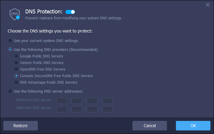 Finally, there’s Privacy & Security, which is a collection of other privacy-related features. One is called Browser Privacy, and will clean up privacy problems detected in your web browser. Another, Ads Block, blocks unwanted and malicious ads to help stop malware infections. There’s also a kill switch option and DNS protection, two features you should absolutely enable if you want ultimate protection.