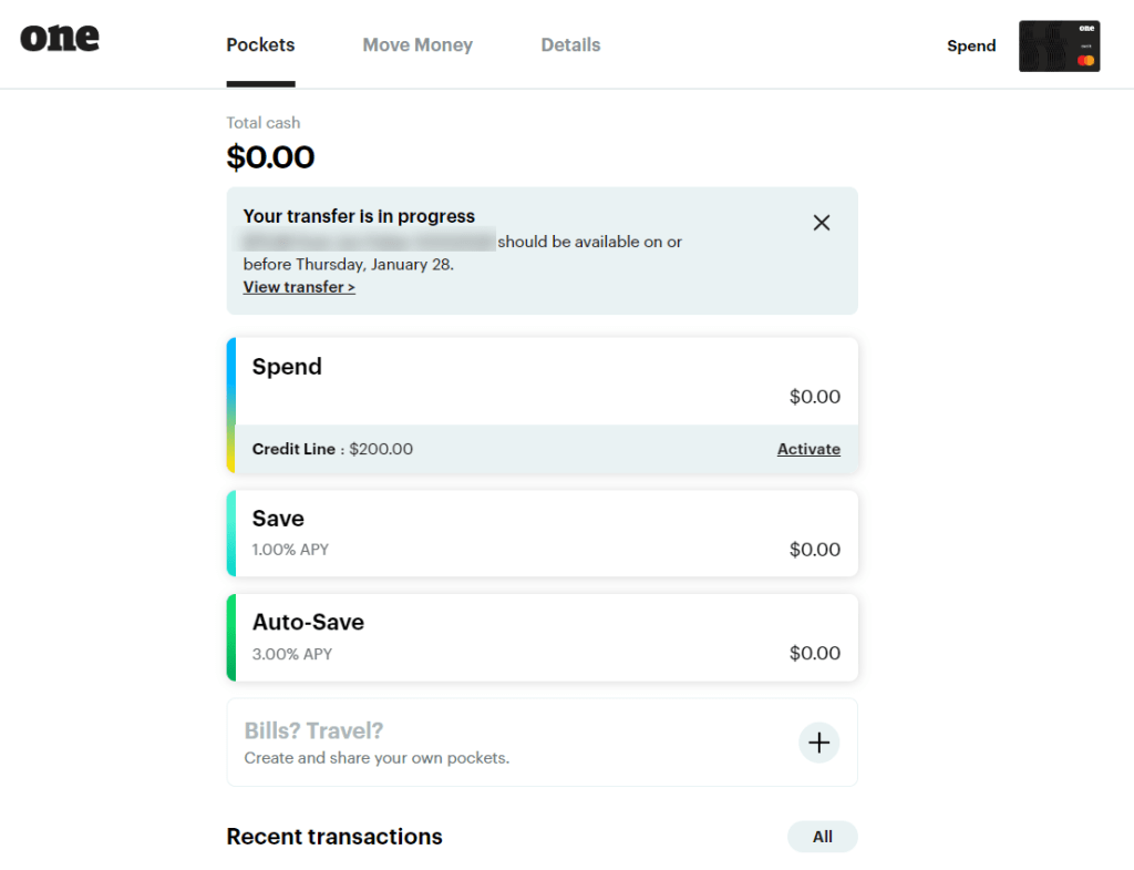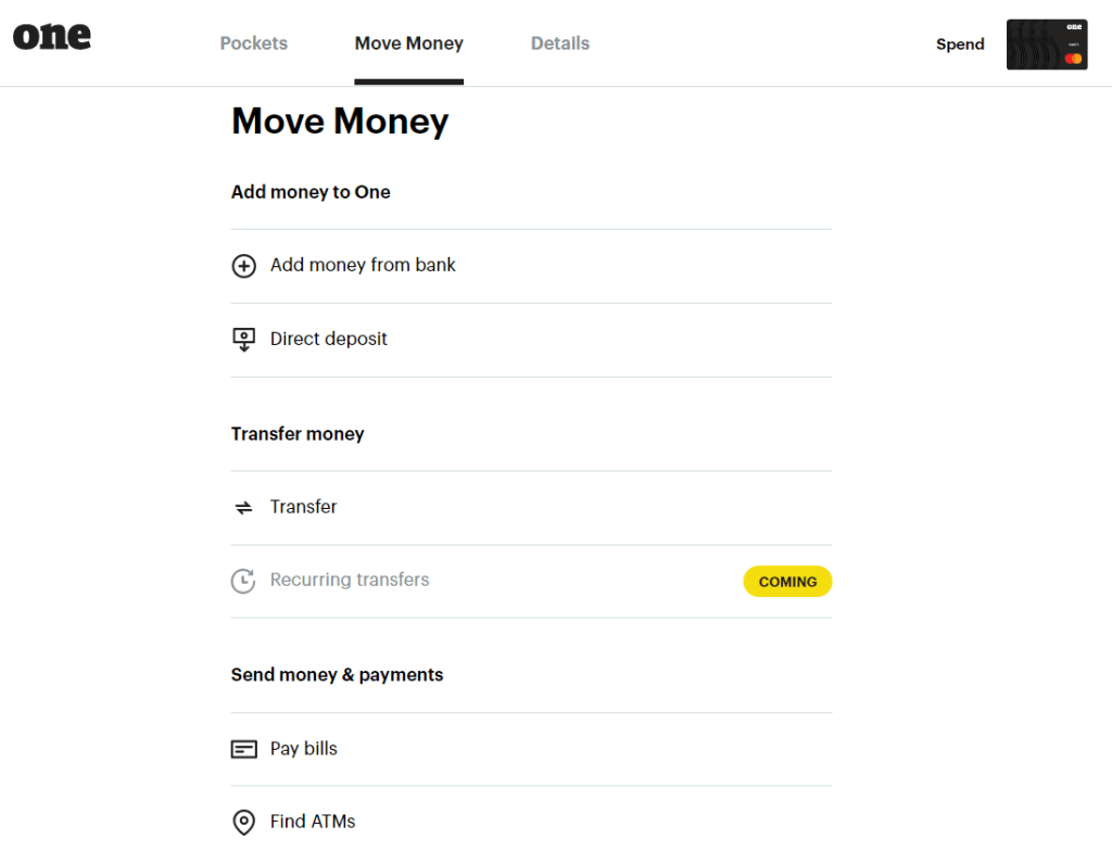 Move Money is where you go to add money to your One bank account, transfer money between pockets or out of your bank, pay bills, etc. Further on down this page is also where your routing number and account number is, for both your Spend and Save account.